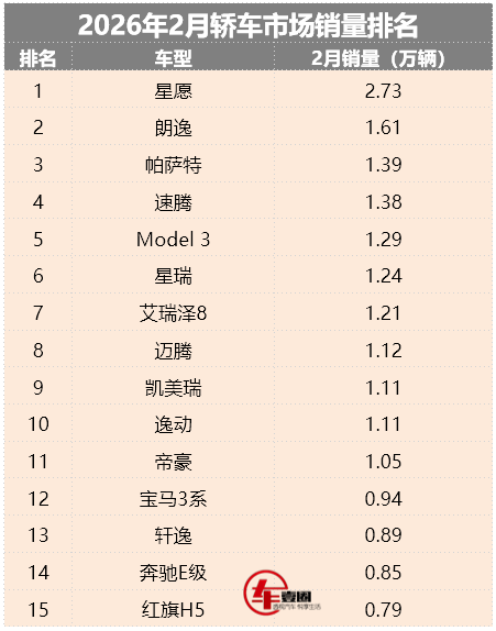 纵观2月轿车销量排名,居然仅有星愿、Model 3两款新能源车型进入前15位。其中,星愿销量超2.73万辆,Model3销量超1.29万辆,而其它新能源轿车排名均在第17位之后了。